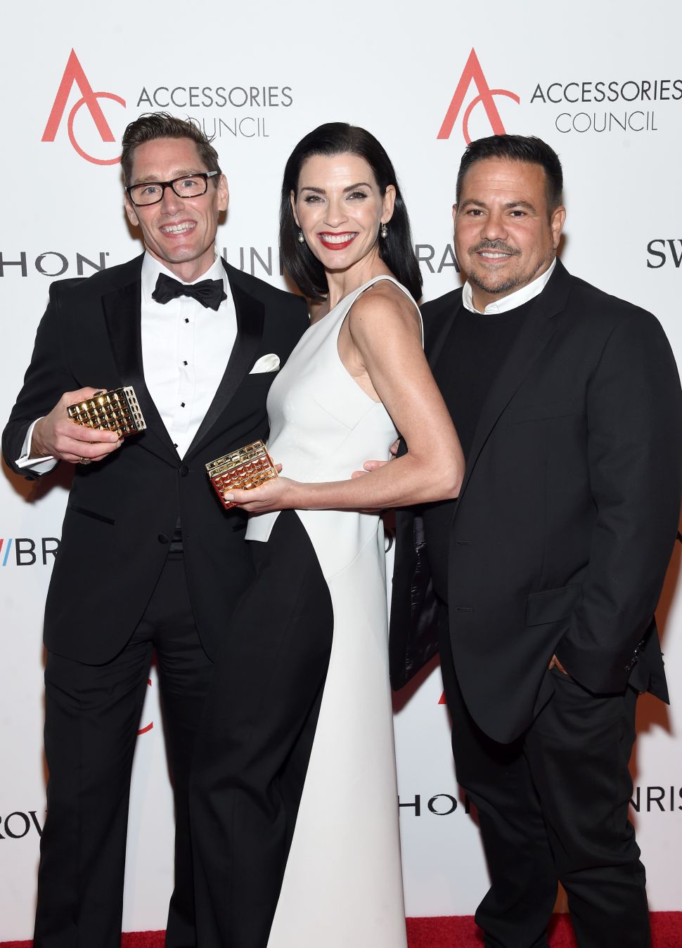 NEW YORK, NY – AUGUST 02: (L-R) Daniel Lawson, Julianna Margulies and Narciso Rodriguez poses with awards during the Accessories Council 20th Anniversary celebration of the ACE awards at Cipriani 42nd Street on August 2, 2016 in New York City. (Photo by Jamie McCarthy/Getty Images for Accessories Council)